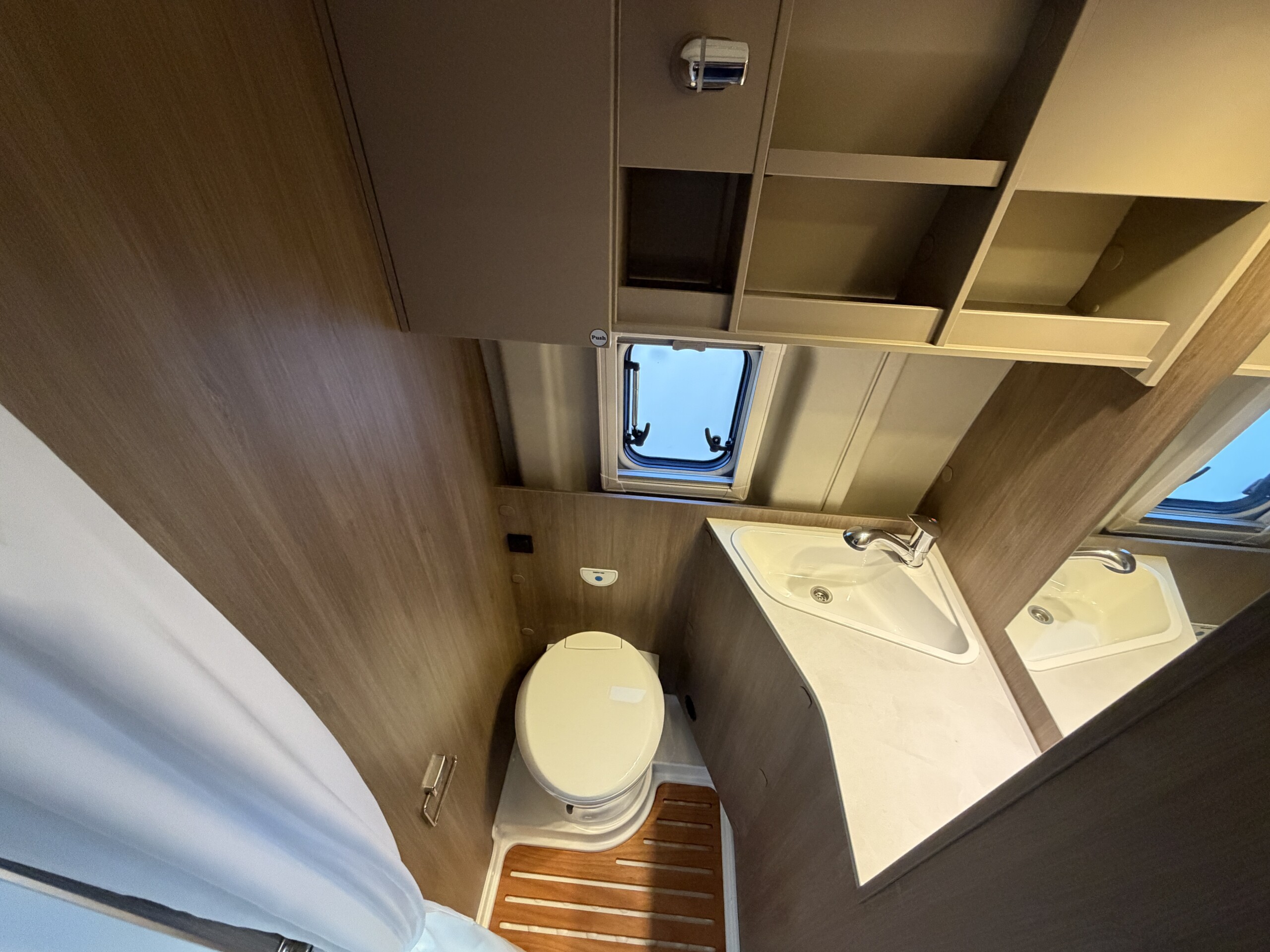 V kúpeľni umývadlo, kazetová toaleta Thetford C223, sprcha so závesom a strešným oknom.